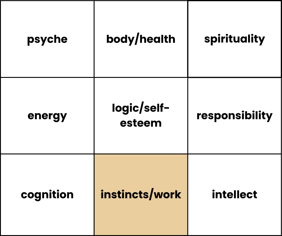 Here, in this cell, we can see the instinctive capacity & need of a person to work and hunt on the physical realm (money, material things, the opposite sex, to develop businesses and accumulate wealth) and capacity and willingness to accomplish duties requested by others.