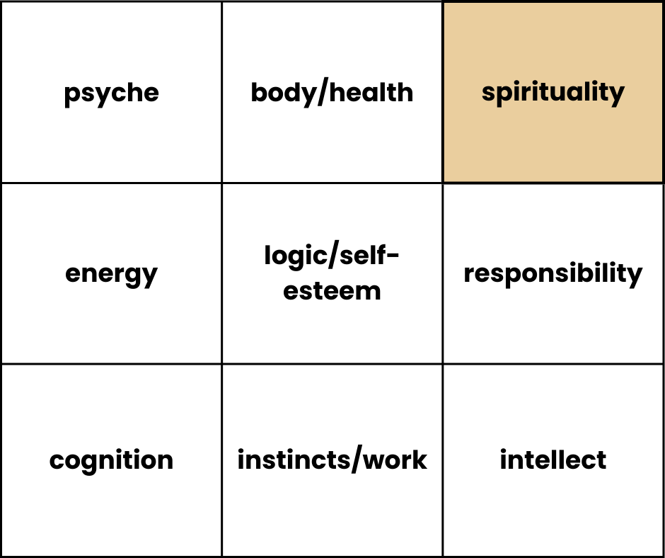 | 1 Psyche/Character | 4 Physical Body/Health | 7 Spirituality |